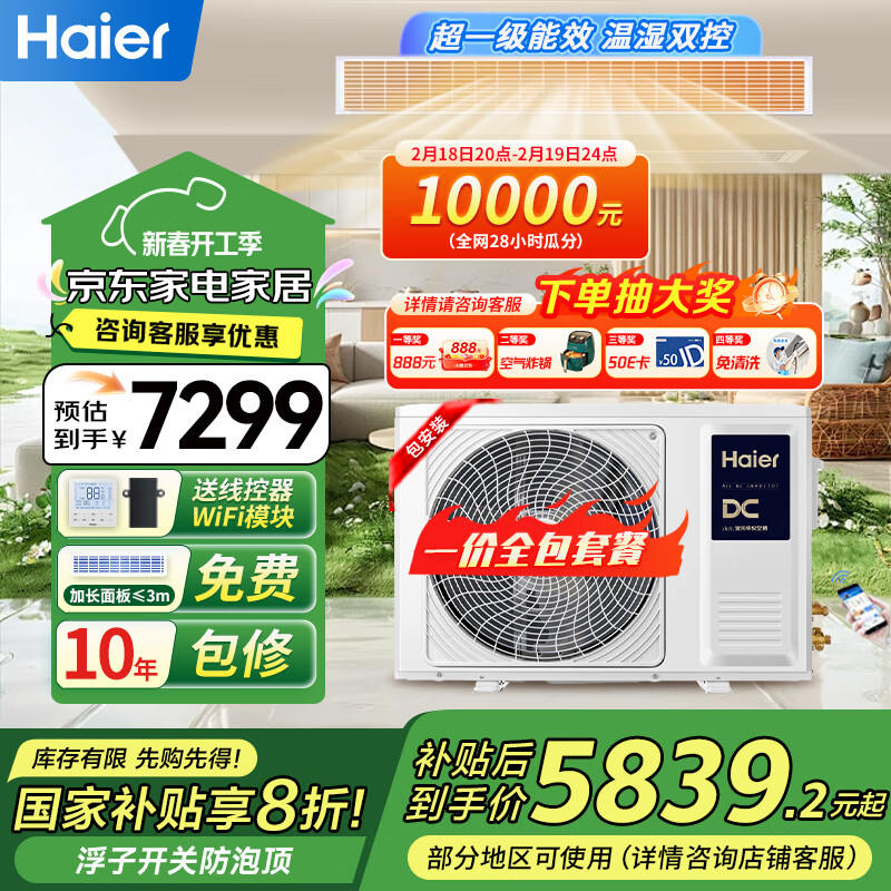 海尔(Haier)中央空调风管机一拖一 家用3匹嵌入式空调3p云舒变频一级KFRd-72NW/72ECD81一价全包 家电补贴价格:7399.00元!