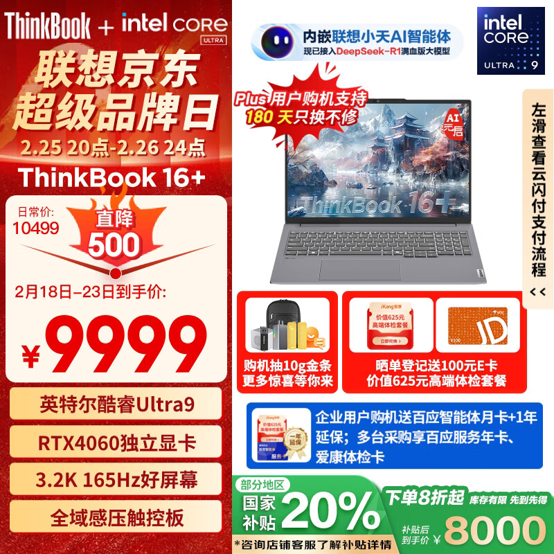ThinkPad【补贴20%】联想笔记本电脑ThinkBook 16+ AI全能本 英特尔酷睿Ultra9 32G 1T 3.2K RTX4060价格:9999.00元!
