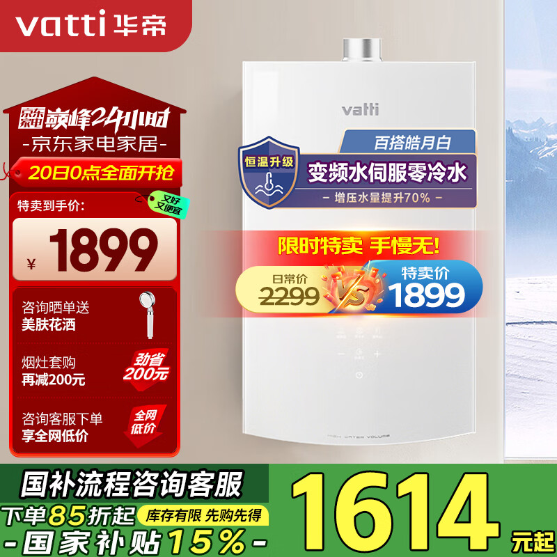 华帝(VATTI)政府补贴官方16升燃气热水器天然气白色零冷水变频水伺服玻璃屏全水路杀菌i12071S-16以旧换新价格:2199.00元!