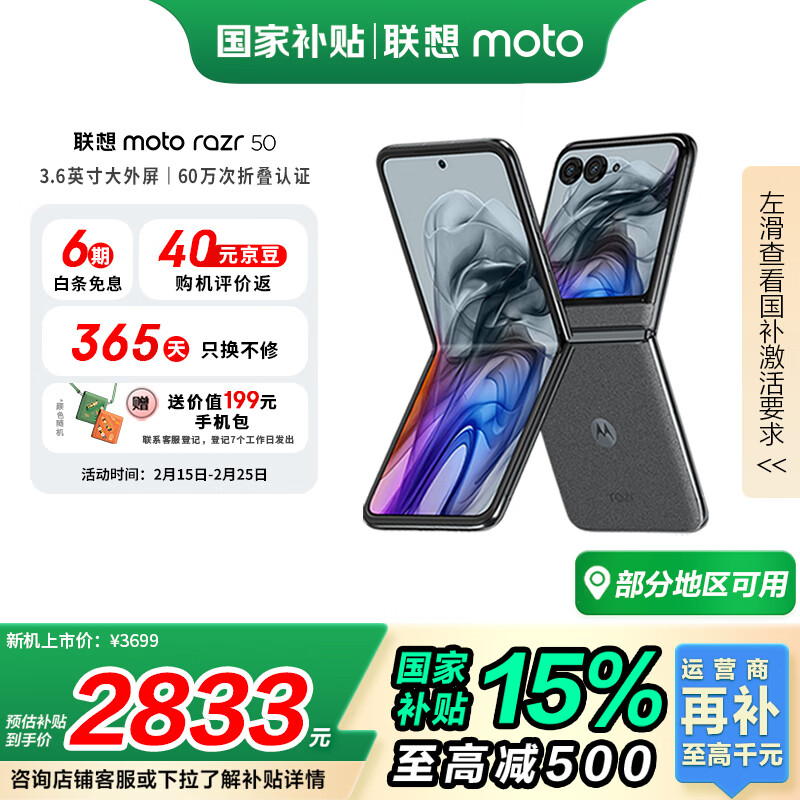 摩托罗拉【补贴】联想moto razr 50 超轻时尚 多功能大外屏 60万次折叠认证 5GAI手机 8+256GB月绒黑价格:3399.00元!