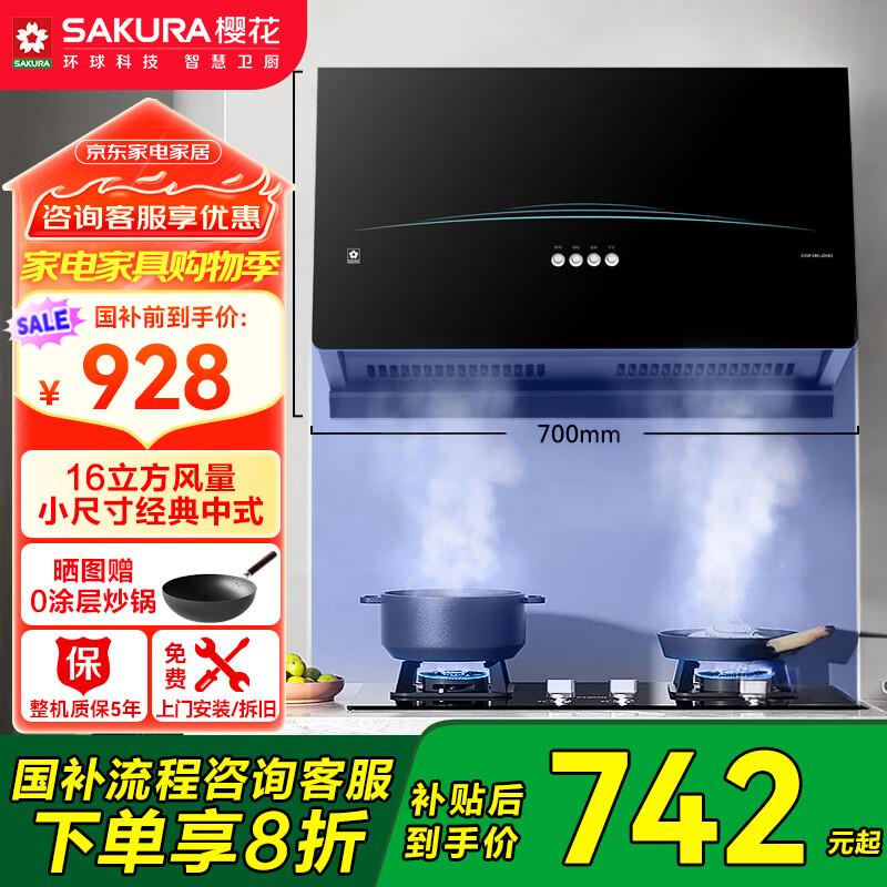 樱花(SAKURA)【补贴至高20%】抽油烟机家用经典中式油烟机700mm小尺寸16m3/min大风量CXW-260-JZA02价格:928.00元!