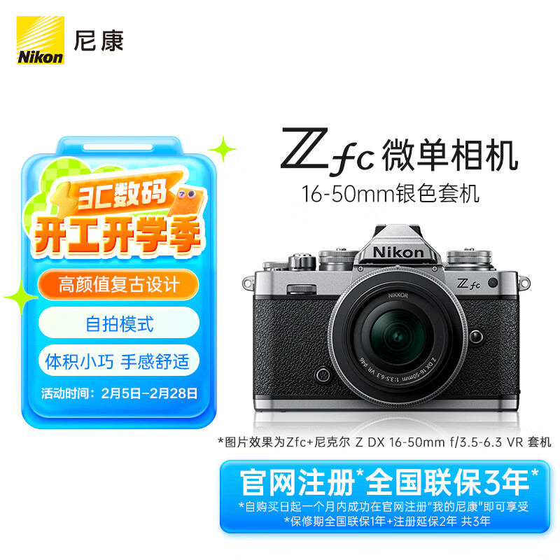 尼康(Nikon)Zfc 微单数码相机 (Z fc)(Z DX 16-50mm f/3.5-6.3 VR 微单镜头) 银黑色 4K超高清视频价格:7349.00元!