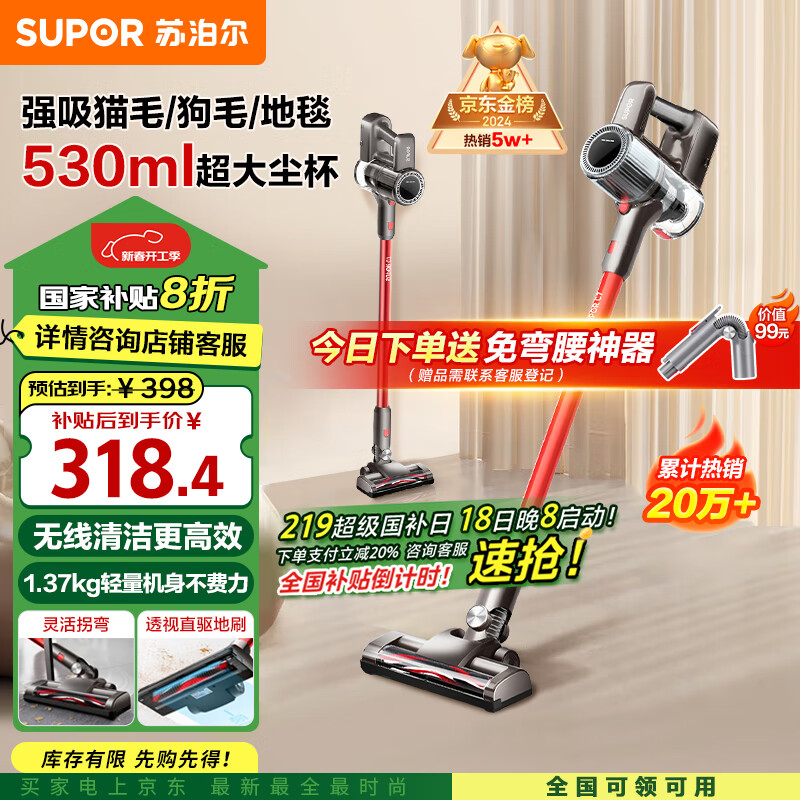 苏泊尔(SUPOR)无线手持吸尘器家用大吸力便携立式充电宠物猫毛狗毛地毯一键倒尘节日礼品C7【补贴】价格:398.00元!