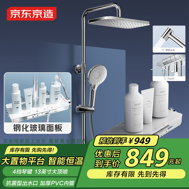 京东京造钢琴师琴键恒温淋浴花洒全套装 四功能淋浴器顶喷增压喷枪典雅银价格:849.00元!