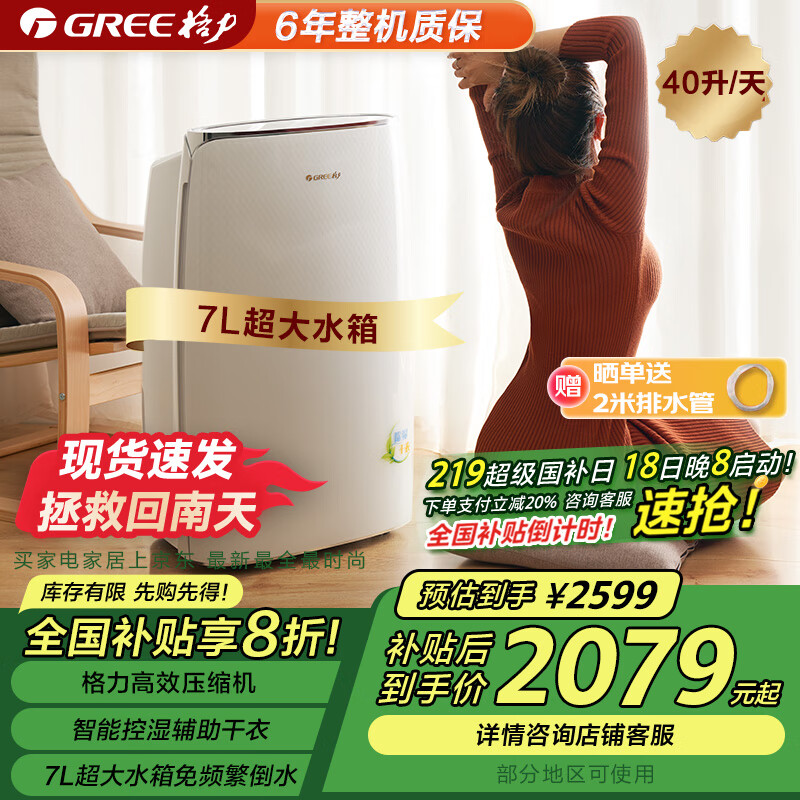 格力(GREE)除湿机家用抽湿机低噪 40升/天60~72㎡ 地下室卧室商用工业除潮除霉除湿器 智能控湿可干衣DH40EF价格:2599.00元!