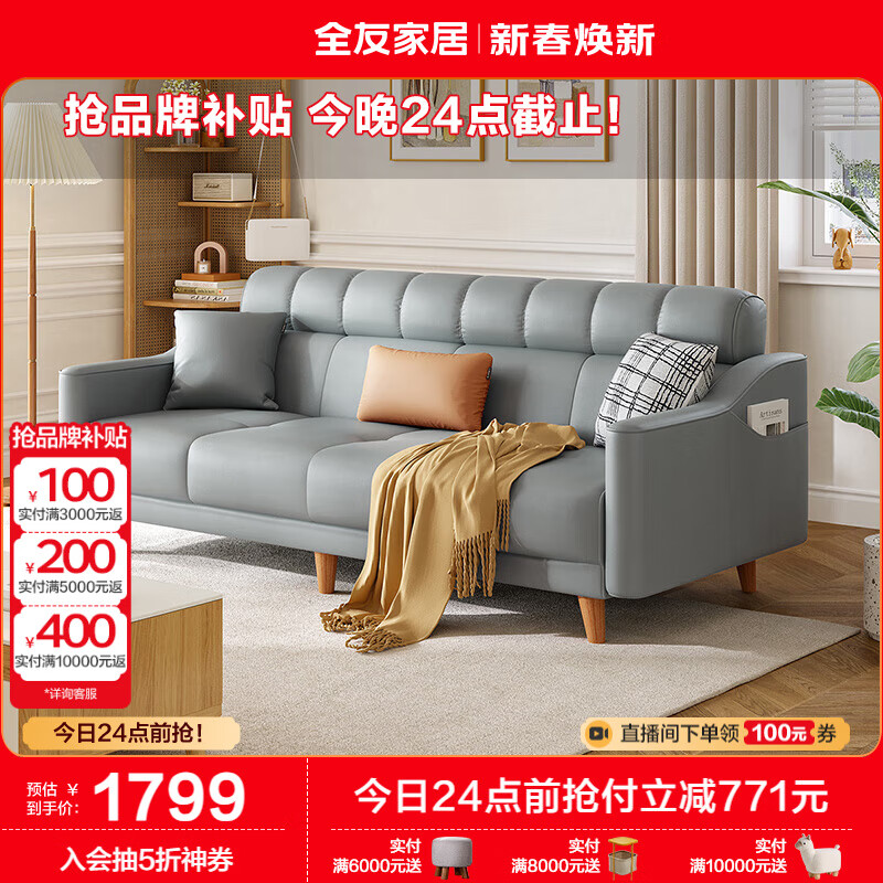 全友家居 现代北欧简约布艺沙发客厅三人位小户型可折叠沙发床102265价格:2570.00元!