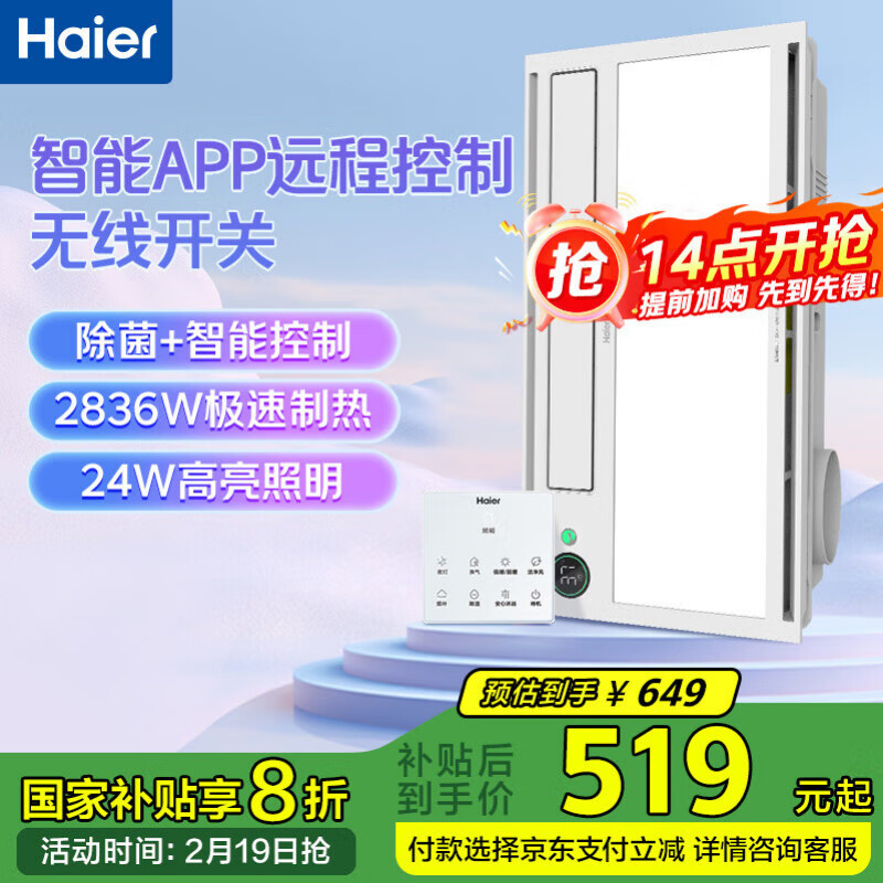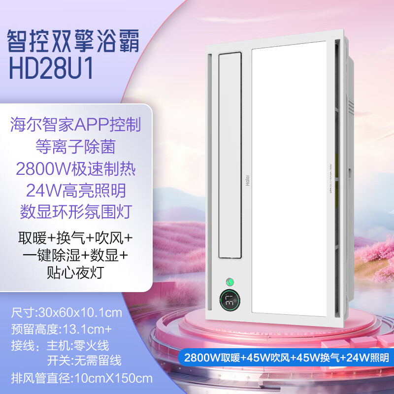 海尔智能风暖浴霸暖风照明排气一体卫生间暖风机浴室集成吊顶智控28价格:599.00元!