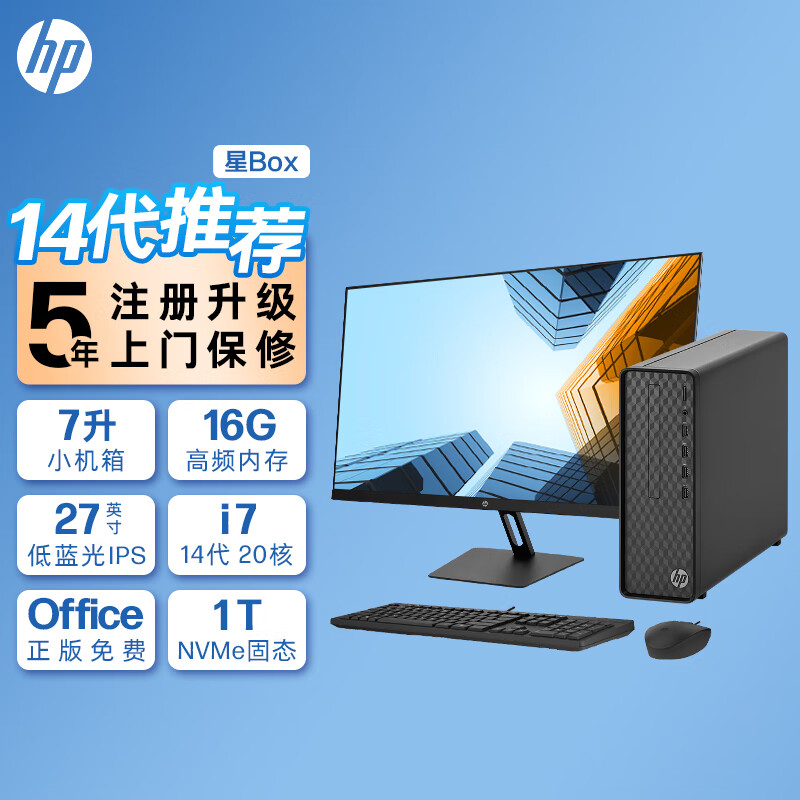 惠普HP 补贴 星Box高性能商务办公台式电脑台式机 (14代i7-14700 16G 1TB 注册五年上门)+27英寸价格:5899.00元!