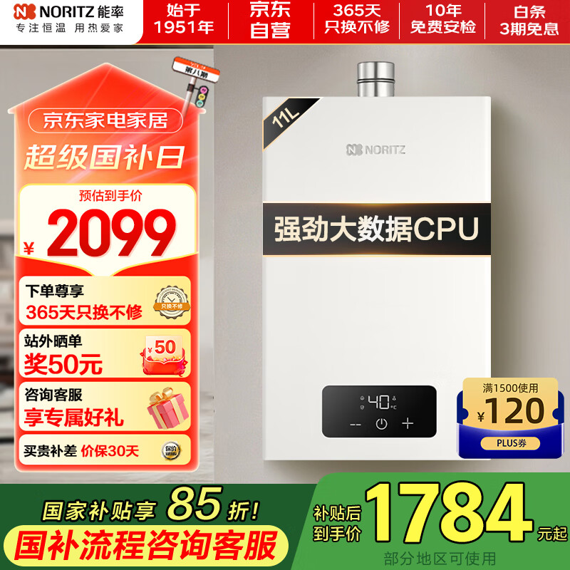 能率(NORITZ)燃气热水器11升【家电补贴15%】全屋恒温巡航 多点用水恒温 GQ-11EA2FEX天然气防冻*价格:2099.00元!