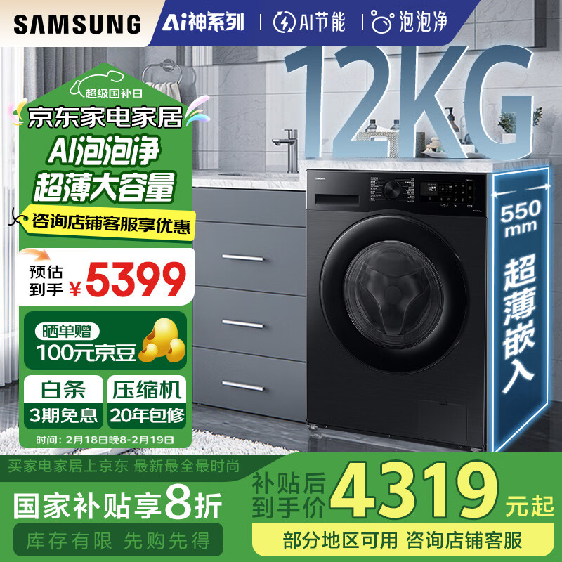 三星(SAMSUNG)AI神洗衣机5系 12KG全自动滚筒AI泡泡净蒸汽除菌超薄嵌入以旧换新补贴黑WW12DG5B24ABSC价格:16999.00元!
