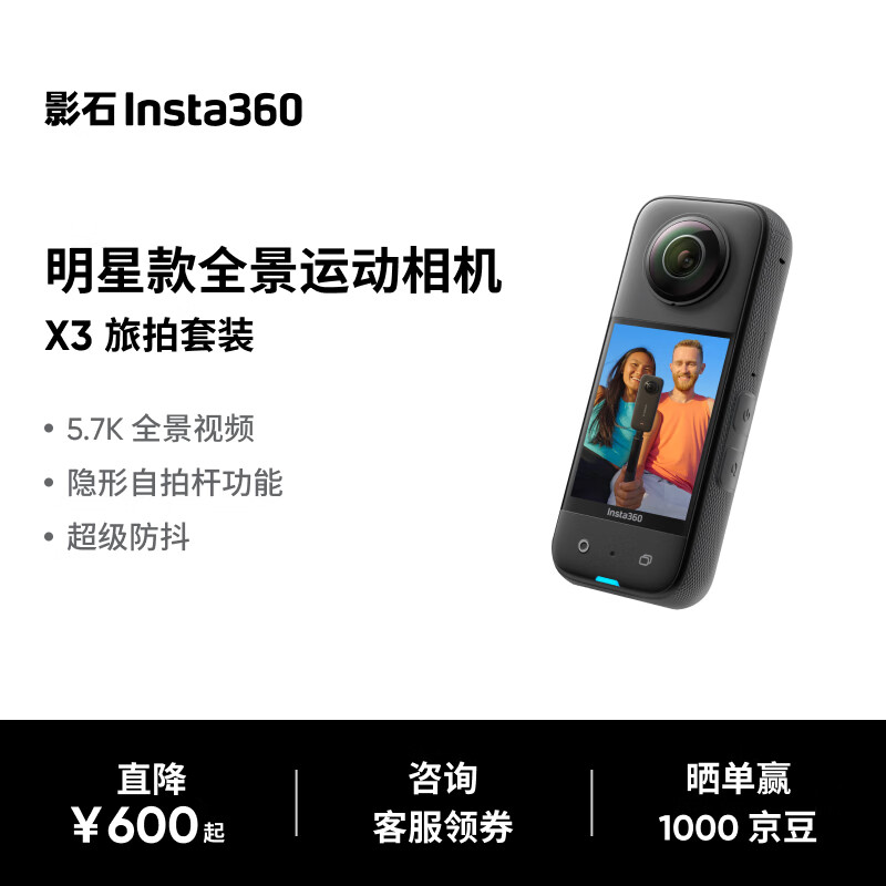 Insta360影石 X3全景运动相机防抖相机5.7K高清360全景摄像机摩托车vlog滑雪(旅拍套装)价格:2678.00元!