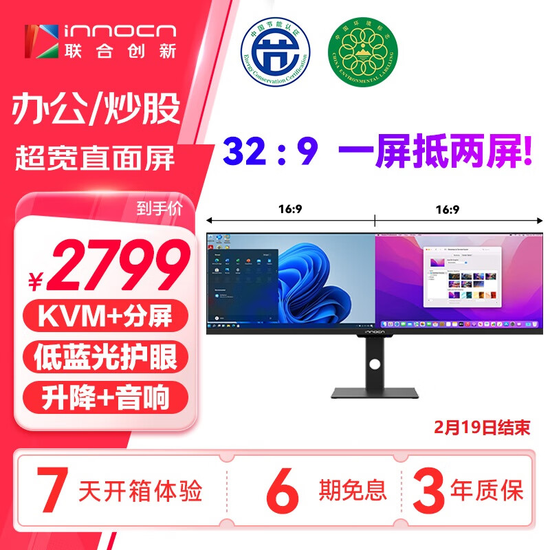 联合创新43.8英寸32:9 超宽直面屏 专业校色 智慧双显 防蓝光带鱼屏 剪辑炒股设计办公电脑显示器44C1G价格:2799.00元!