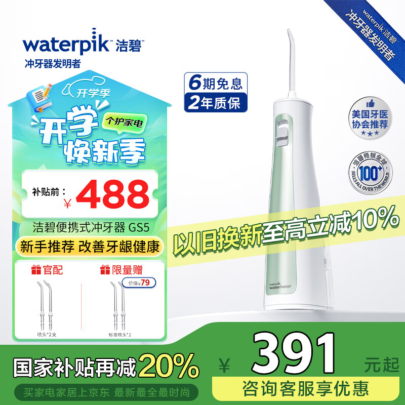 洁碧(Waterpik)冲牙器便携式电动洗牙器水牙线洁牙器家用立式预防牙结石全身水洗 GS5绿三八节女神礼物价格:488.00元!