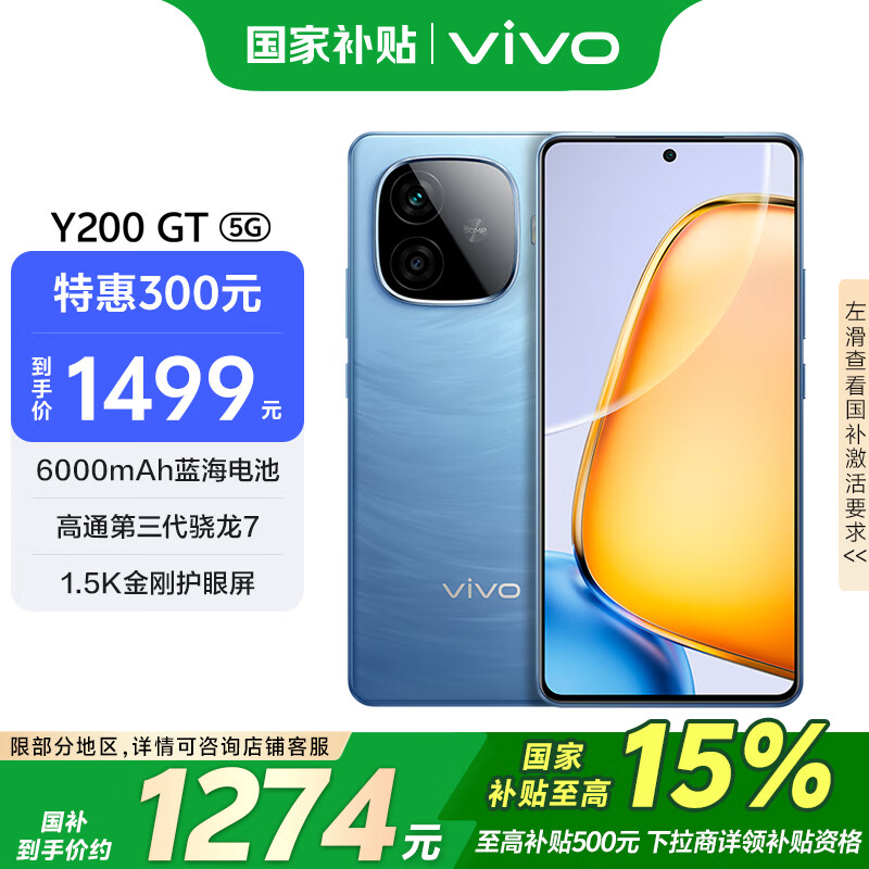 vivo Y200 GT 12GB+256GB 风暴 补贴 6000mAh+80W长续航大电池快充 第三代骁龙7 轻薄游戏手机价格:1999.00元!