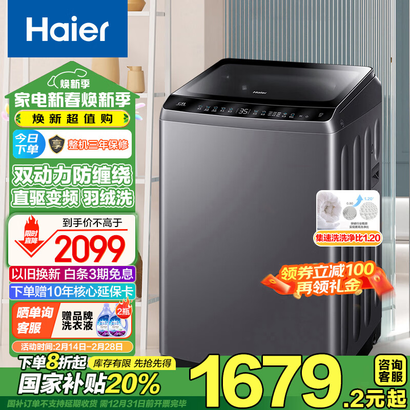 海尔(Haier)【补贴20%】10KG双动力防缠绕波轮洗衣机全自动直驱变频一级能效预约洗+除螨洗XQS100-BZ3288价格:2199.00元!