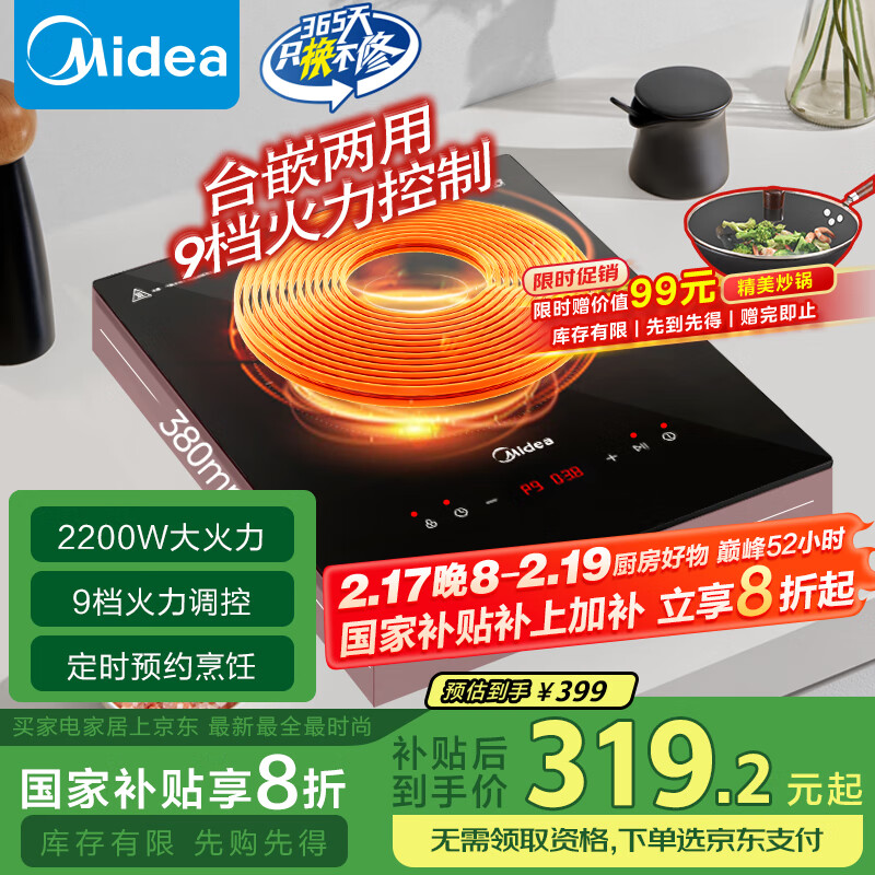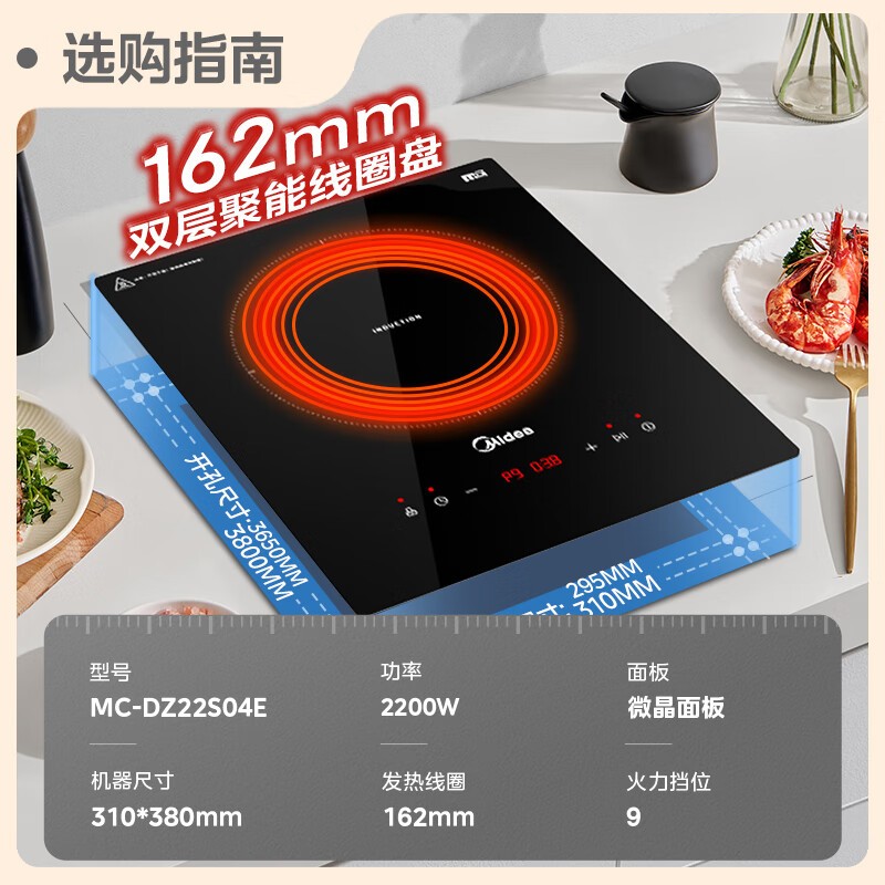 美的(Midea)电磁炉电磁灶电陶炉【补贴】单灶2200W家用大功率滑触双控 9档嵌入式定时功能火锅炉 DZ22S04E价格:399.00元!