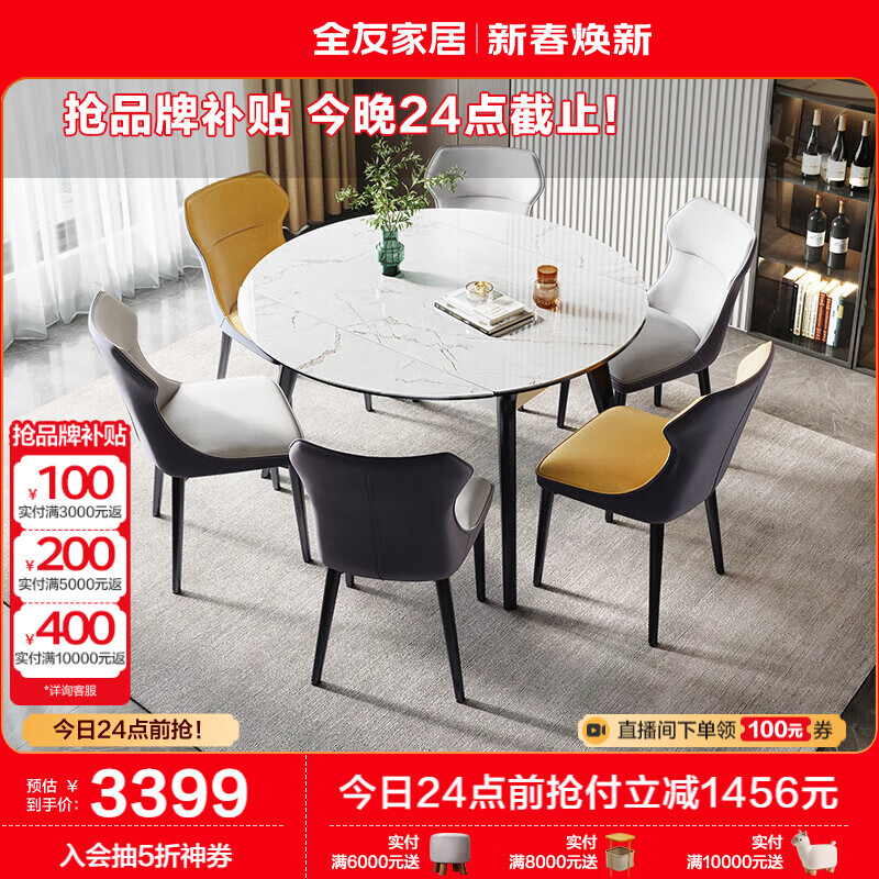 全友家居 岩板餐桌椅组合客餐厅家用轻奢风吃饭桌子一桌四椅子DW1059价格:4855.71元!