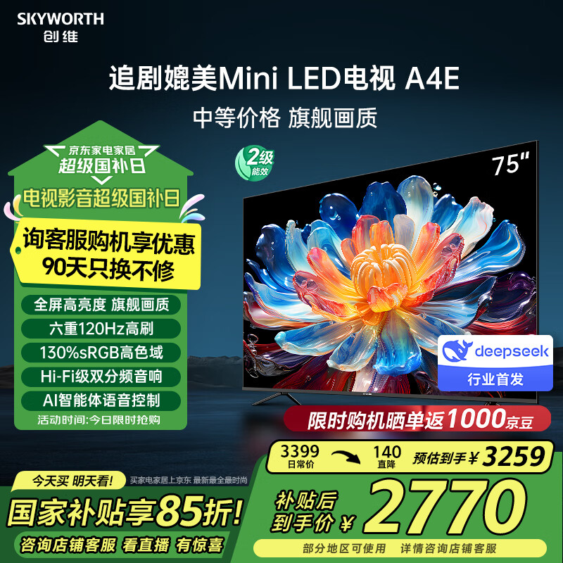 创维电视75A4E 75英寸deepseek AI电视机 媲美mini led 十电 3+64G智慧屏家电液晶4K超薄游戏价格:3259.00元!