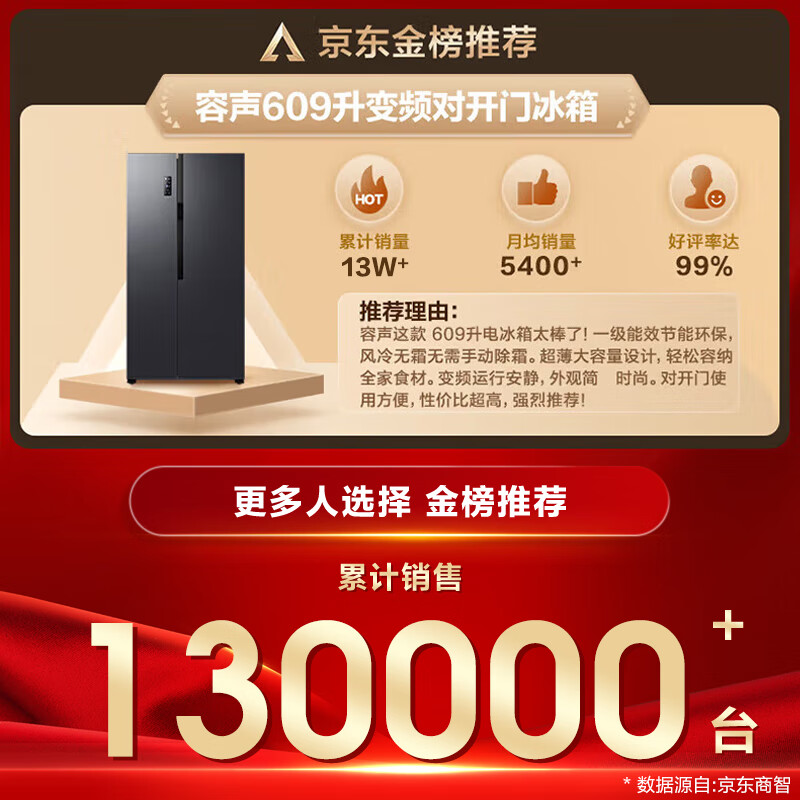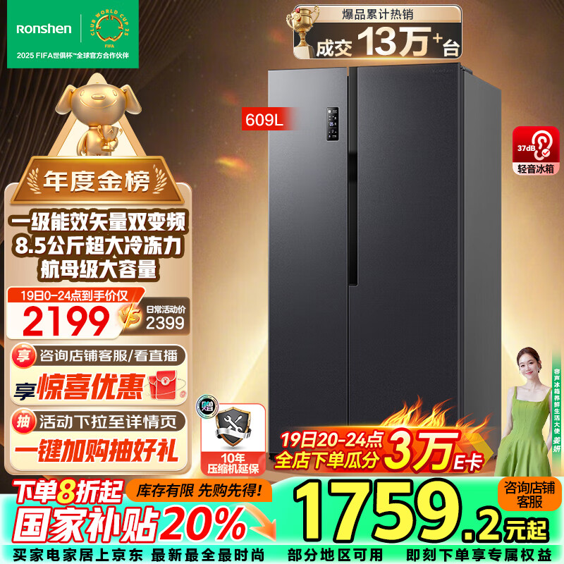 容声609升对开门双开门电冰箱家用变频一级能效节能风冷无霜超薄大容量BCD-609WD11HP家电补贴20%价格:2198.99元!