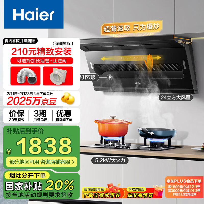 海尔(Haier)抽油烟机 顶侧双吸烟灶套装 政府补贴20%油烟机 24风量大吸力 5.2kw大火力64%高热效灶C51+BE6天价格:2298.00元!