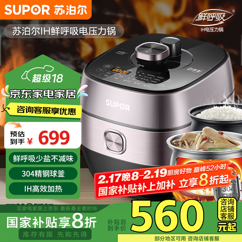 苏泊尔(SUPOR)【补贴】鲜呼吸IH电锅5L家用智能自动排气304精钢球釜SY-50HC8033Q双胆电饭煲高压锅3-6人价格:699.00元!