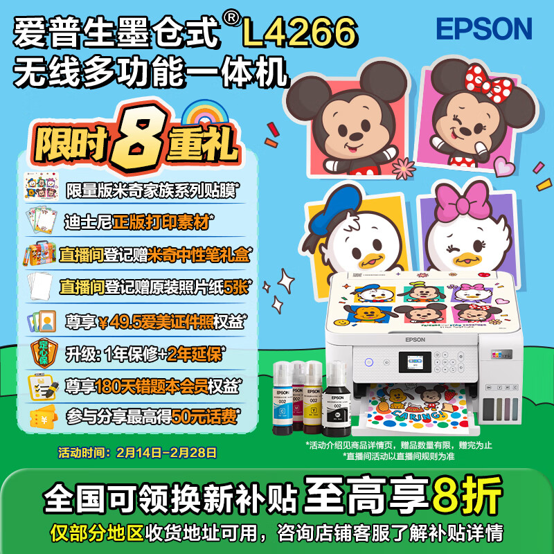 爱普生(EPSON)L4266墨仓式彩色无线多功能一体机家用/办公打印(打印复印扫描 wifi 自动双面)价格:1499.00元!