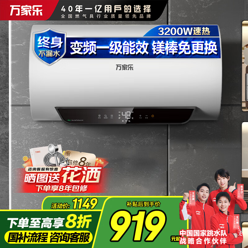 万家乐80升电热水器家用储水式 补贴20% 镁棒免换 出水断电 3200W速热 变频一级能效D80-DW5以旧换新价格:1149.00元!