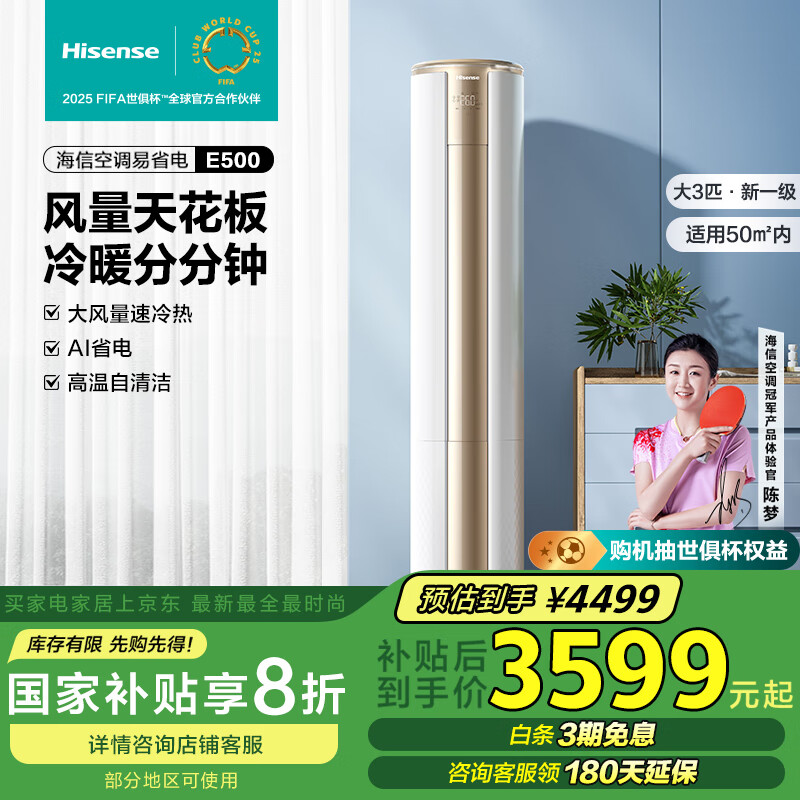 海信(Hisense)大3匹 易省电 空调柜机新一级能效变频大风量自清洁智能立式客厅换新补贴20%KFR-72LW/E500-A1价格:4499.00元!
