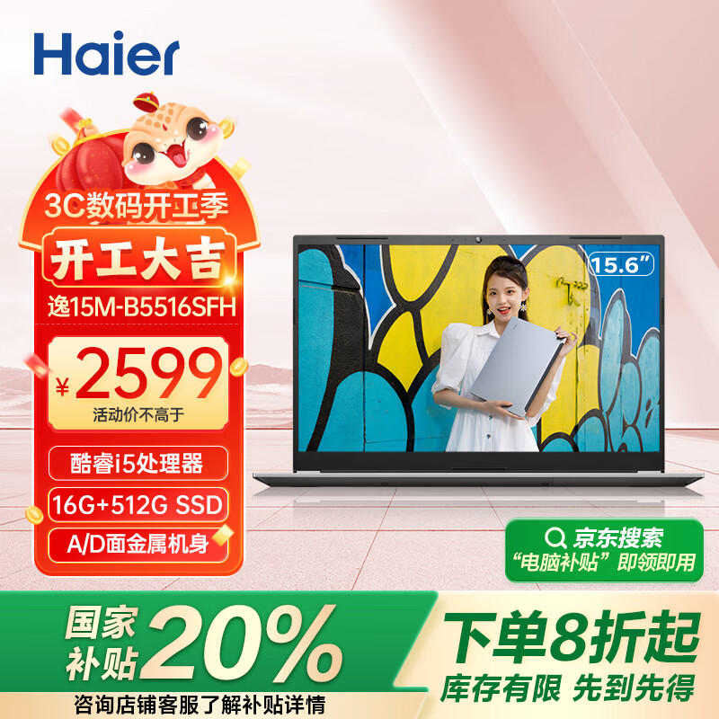 海尔(Haier)15.6英寸金属笔记本电脑 商务办公学生影音娱乐轻薄本逸15M(i5 16G 512G SSD 100%sRGB Win11)价格:2599.00元!
