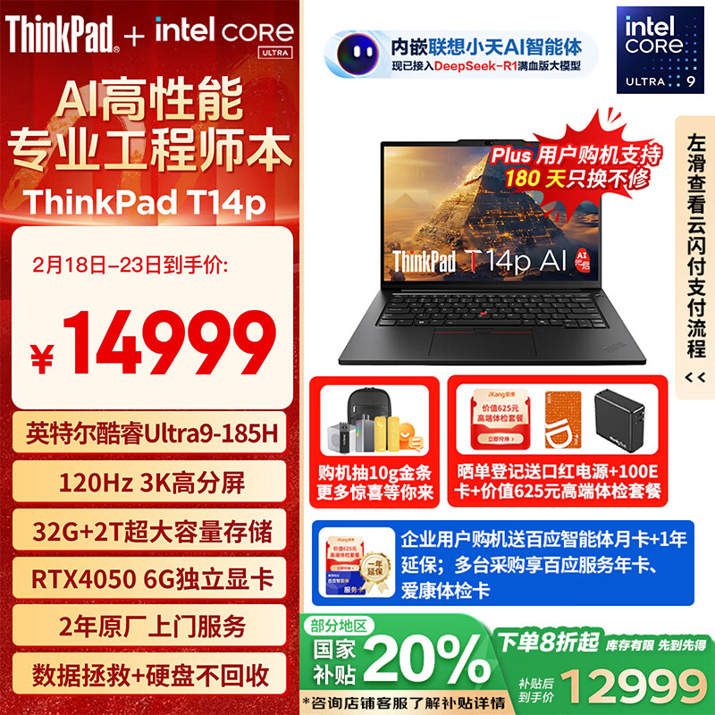 ThinkPad【补贴20%】T14p AI元启 酷睿Ultra9 185H 14.5英寸高性能笔记本电脑 32G 2TB 3K RTX4050价格:14999.00元!