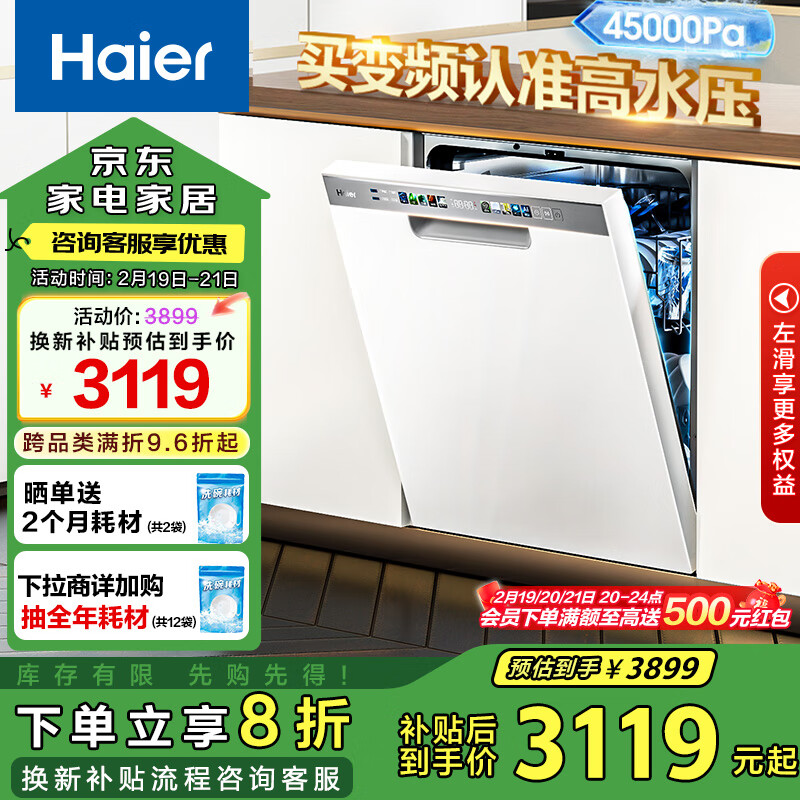 海尔(Haier)【山茶花系列】嵌入式洗碗机W30S白色15套大容量 变频一级水效 分区洗智能开门速干EYBW153286ZBU1价格:3699.00元!