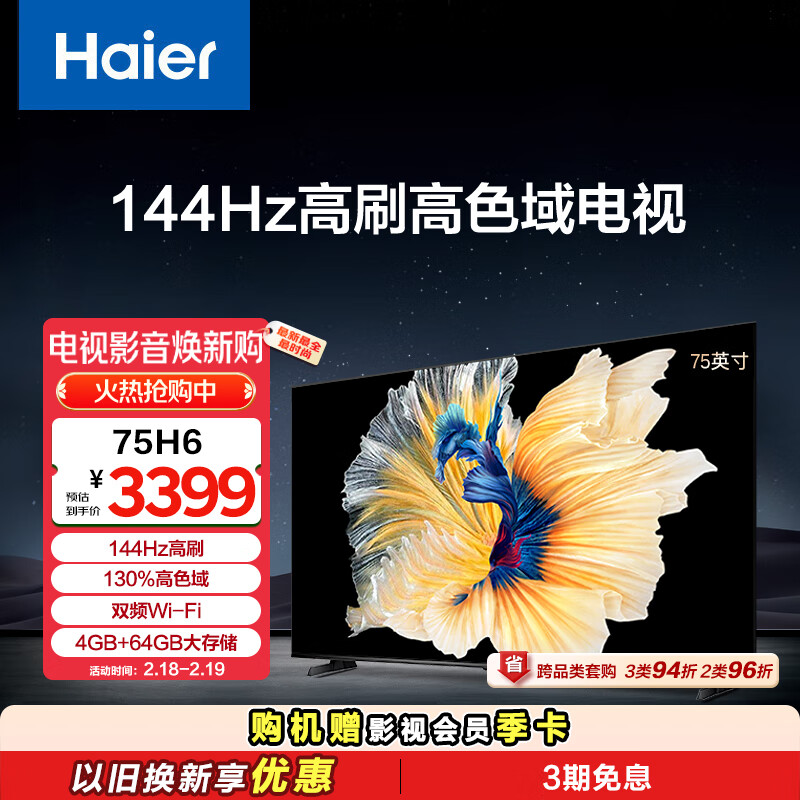 海尔(Haier)75H6 75英寸电视 4K超高清 144Hz屏 4+64GB 超薄游戏电视智能液晶平板电视机以旧换新价格:3399.00元!