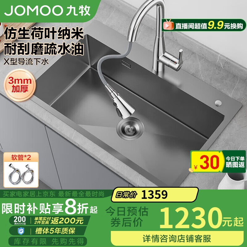 九牧(JOMOO)不锈钢手工水槽大单槽厨房洗菜盆单槽洗碗池70*45(含龙头)02264价格:1290.00元!