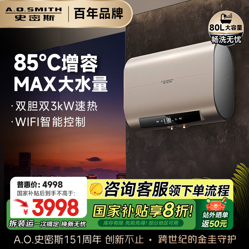 史密斯(A.O.SMITH)80升补贴电热水器 超薄双胆扁桶 金圭特护 双3kW速热 智能wifi 85度真增容 E80HGDWi价格:4998.00元!