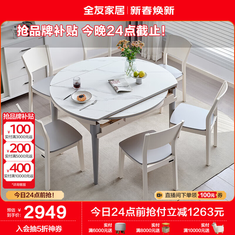全友家居 现代简约餐桌椅组合可伸缩折叠岩板餐桌家用饭桌全套DW1028价格:4212.86元!