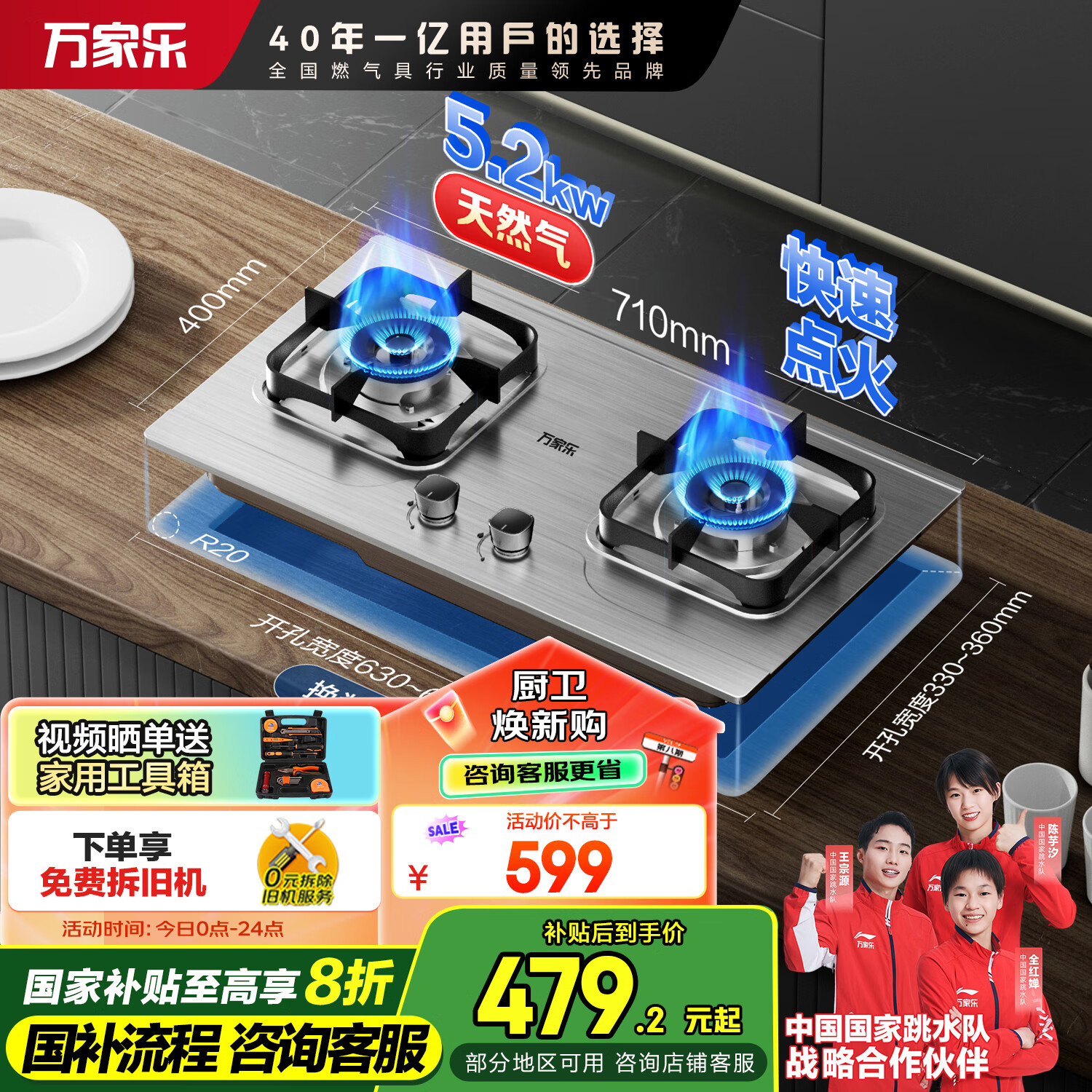 万家乐燃气灶 5.2kW天然气灶不锈钢猛火灶高热效率全进风快速点火燃气灶家用台嵌两用双灶JZT-AY8G天然气价格:599.00元!