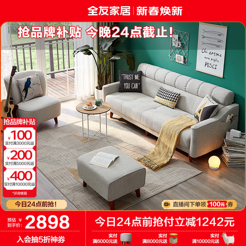 全友家居 现代北欧简约布艺沙发客厅三人位小户型可折叠沙发床102265价格:4140.00元!