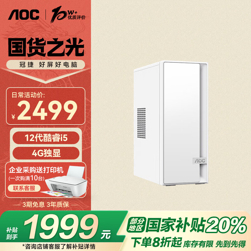 AOC补贴20%荣光920电脑台式机商用办公整机主机(12代i5-12400F 16G 512G 4G独显 WIFI 键鼠)价格:2499.00元!