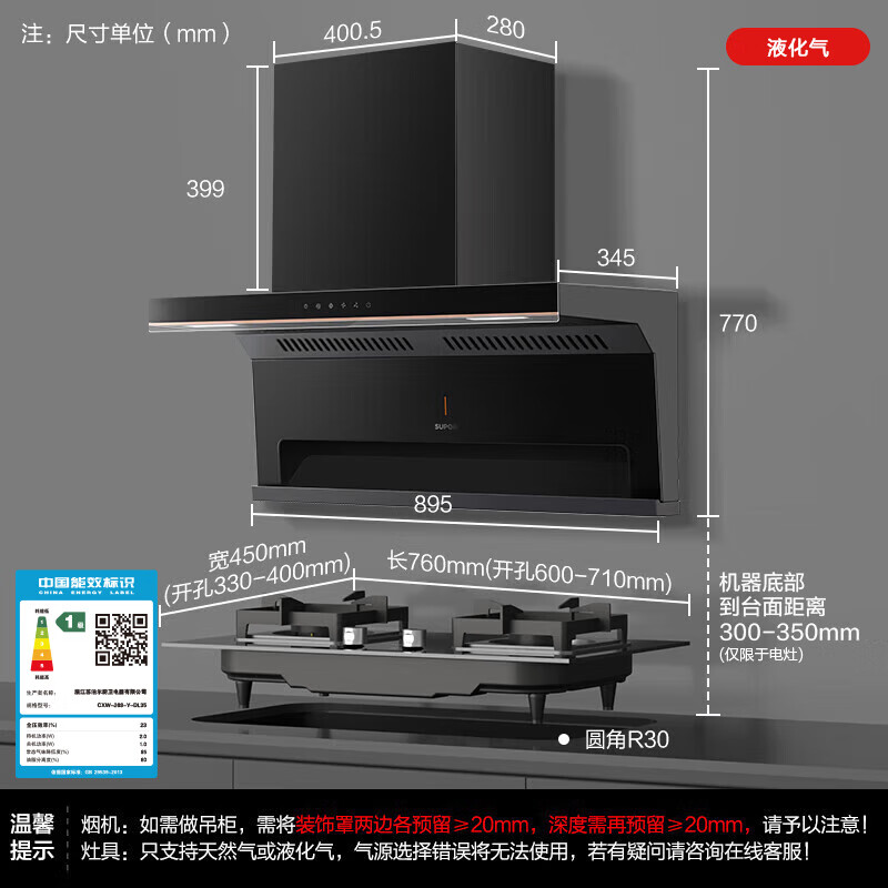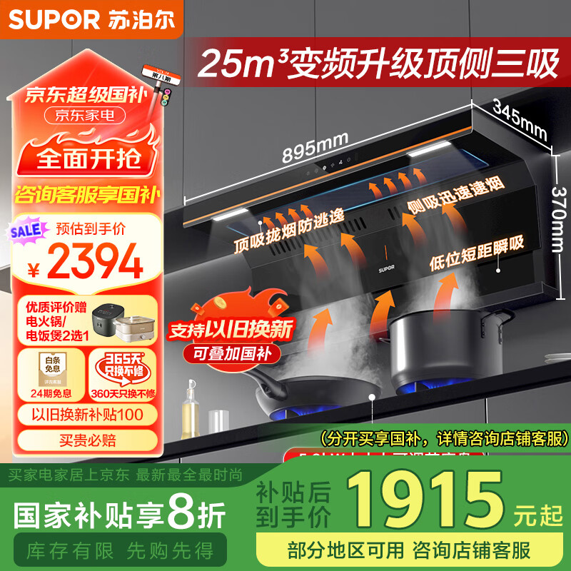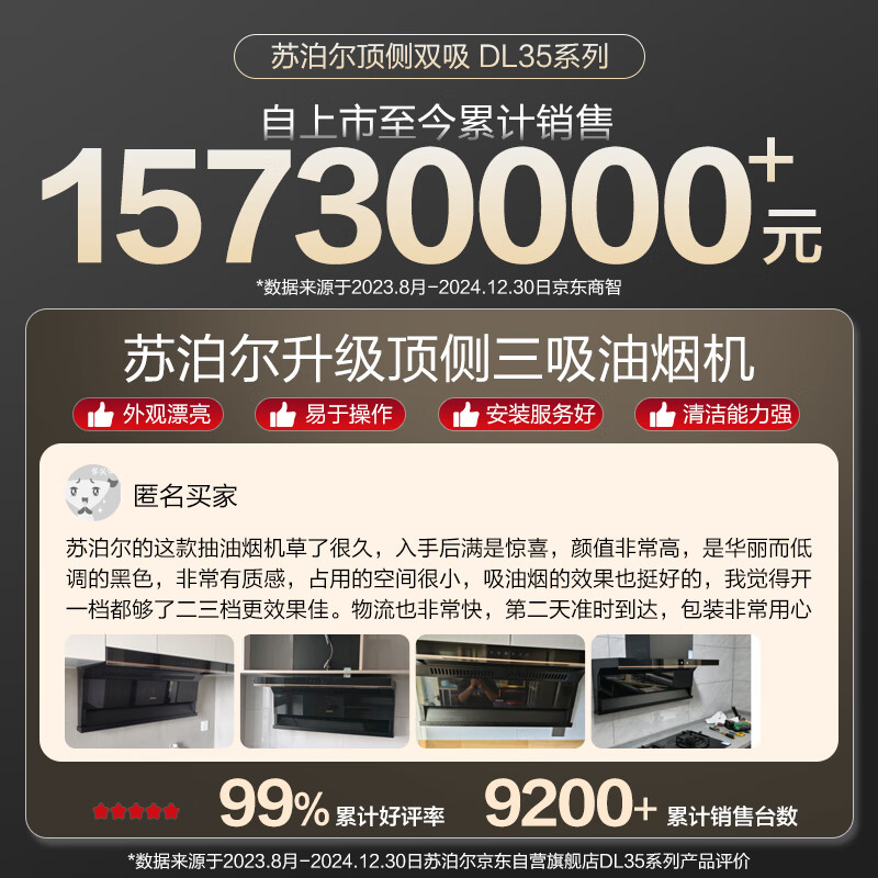 苏泊尔(SUPOR)抽油烟机家用 25立方变频1000Pa风压 顶侧三吸双腔拢烟挥手智控 燃气灶套装DL35+DB28液化气价格:2394.00元!