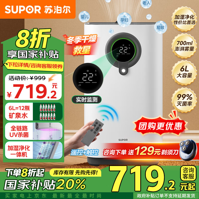 苏泊尔(SUPOR)加湿器空气净化器700ml/h全屋净化过敏源新风除烟味除异味大型无雾加湿净化一体机EHLN-13A-700价格:899.00元!