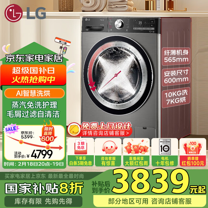 LG小旋风系列 10KG洗烘一体机家用 滚筒洗衣机 直驱变频 360°速净喷淋 银FCW10D4PA补贴以旧换新价格:4799.00元!