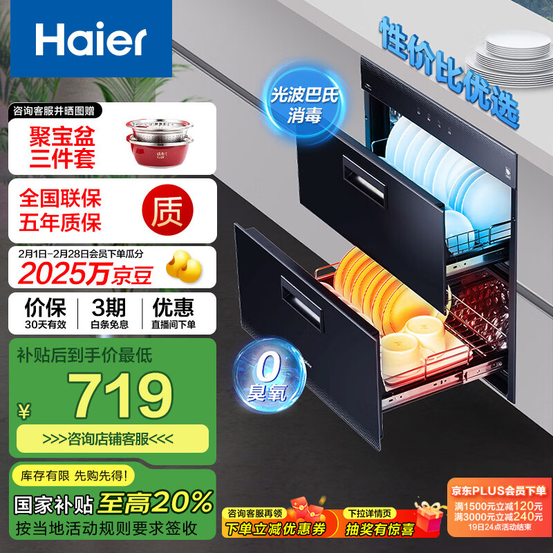 海尔(Haier)消毒柜家用嵌入式 消毒碗柜 奶瓶消毒 双二 紫外线+光波巴氏消毒0臭氧 母婴消毒童锁保护12LCS价格:899.00元!