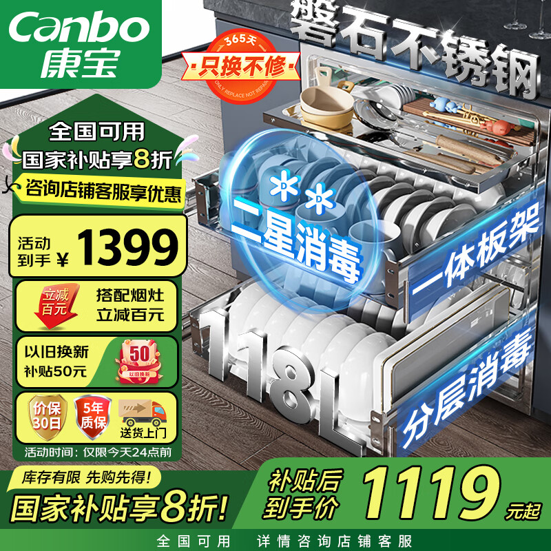 康宝(Canbo)118L三层不锈钢磐石消毒柜嵌入式家用大容量二星高温板架消毒碗柜【补贴】XDZ110-EN321价格:1399.00元!