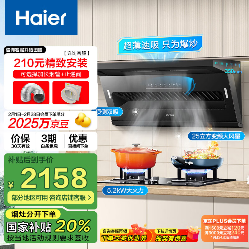 海尔(Haier)抽油烟机 顶侧双吸烟灶套装 变频25m3/min大吸力 家用厨房吸油烟机燃气灶具套装C61+Q2BE3天价格:2698.00元!