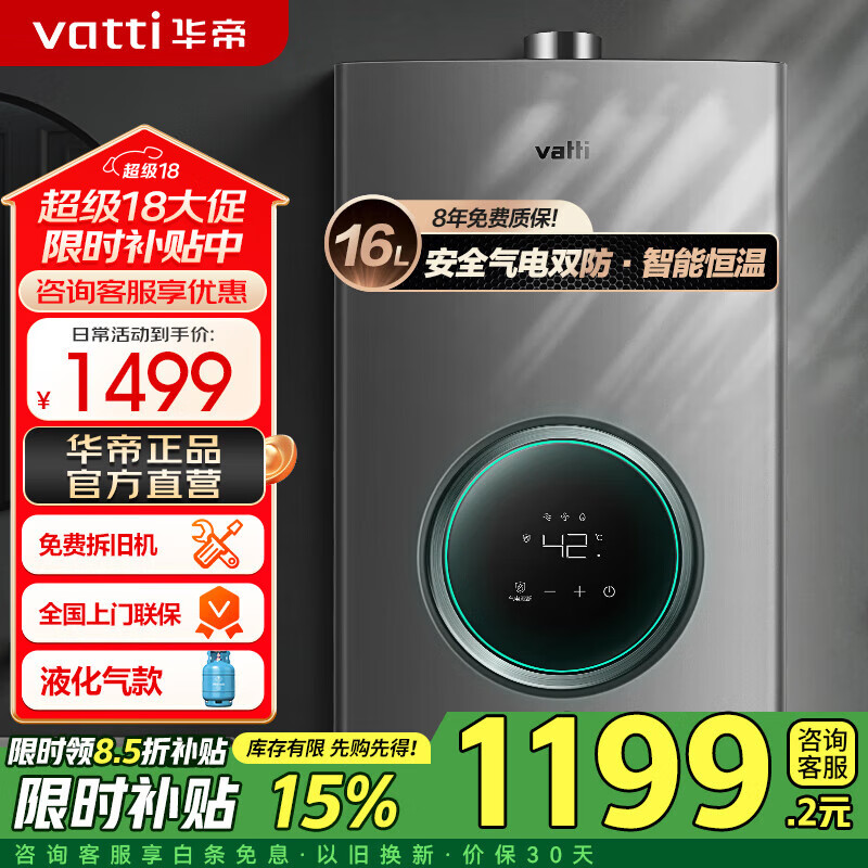 华帝(VATTI)燃气热水器 气电双断防护 水伺服级恒温强排 即热式热水器 防燃气泄漏保护 大升数低压启动 i12103 16L 液化气【一厨多卫】价格:1199.00元!