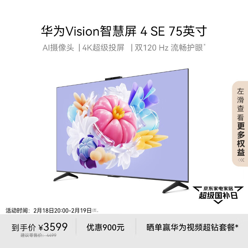华为Vision智慧屏 4 SE 75英寸 Mate 70投屏好搭档 120Hz高刷 游戏电视机以旧换新排行前十名HD75KUNL价格:3599.00元!