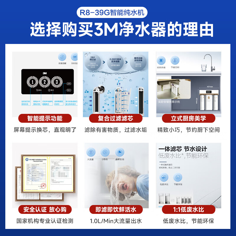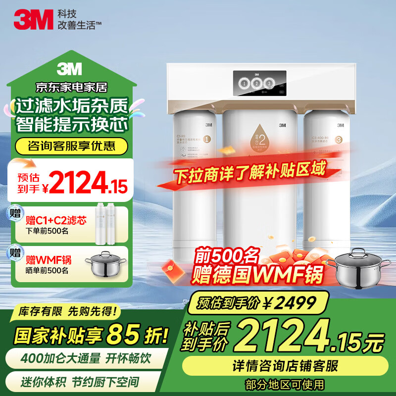 3M净水器家用净水机智能直饮RO反渗透过滤器 400G净饮机无桶大通量纯水机 R8-39G(C)补贴价格:2499.00元!