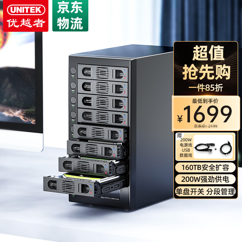 优越者(UNITEK)硬盘柜8盘位2.5/3.5英寸SSD固态/机械磁盘柜八盘企业级电脑外置存储扩展硬盘盒 Y-3373BK价格:1699.00元!