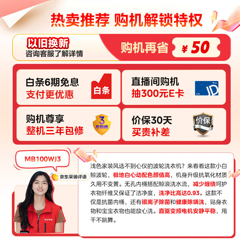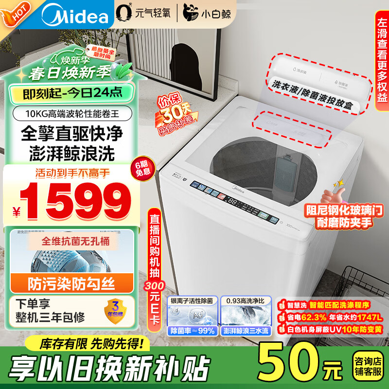 美的(Midea)波轮洗衣机全自动家用 小白鲸MB100WJ3 10公斤元气轻氧 全擎直驱 无孔内桶 以旧换新价格:1599.00元!