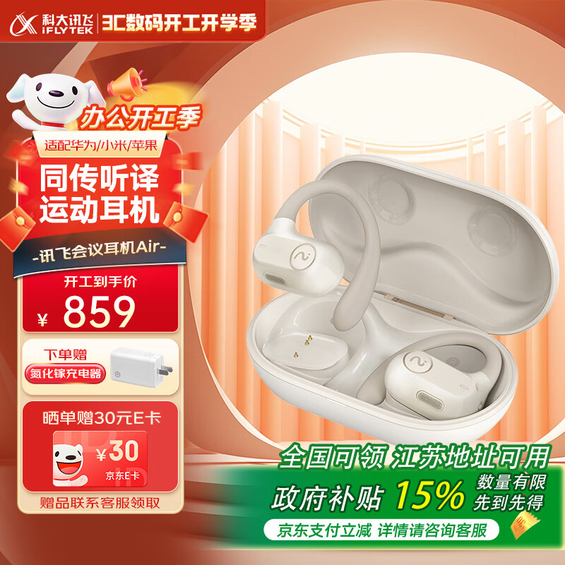 科大讯飞开放式办公耳机 Air 白 无线蓝牙耳机 骨传导升级气传导运动录音耳机 同传听译 适配苹果华为价格:859.00元!